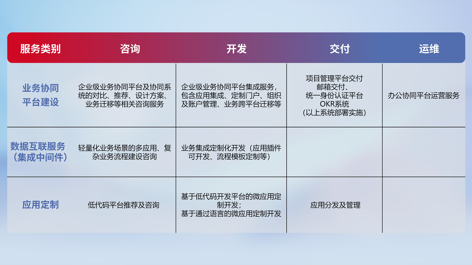 针对钉钉、、、企微、、、IDaas等平台级产品提供产品的规划、、方案、、、、交付、、、、定制化开发等服务,,,,实现如统一协同办公、、智能客户服务、、、混合会议管理、、、、智能数据查询、、等业务场景,,,实现数字化转型。。。